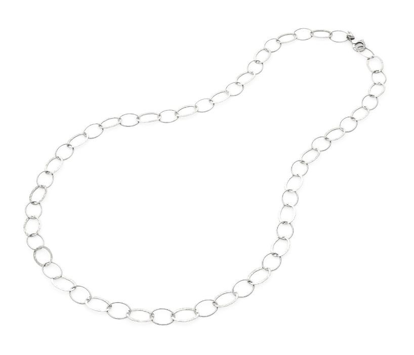 Questa collana in argento di 90 cm alterna due tipi di maglie ovali artigianali, leggere e luminosissime. Le maglie, diverse ma perfettamente armonizzate tra loro, creano un raffinato gioco di movimento e riflessi, valorizzando la lavorazione manuale e l’attenzione ai dettagli. La lunghezza importante permette di indossarla lunga per un effetto slanciato e dinamico, oppure doppiata per un look più avvolgente e deciso. Un gioiello contemporaneo di grande personalità. Fatto a mano in azienda.
