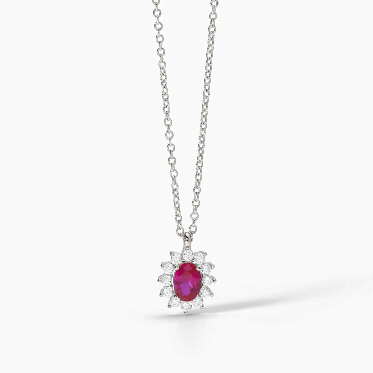 Girocollo regolabile da donna in argento rodiato con catena forzatina, rubino sintetico taglio ovale e zirconi bianchi.