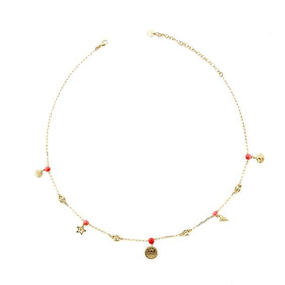 Collana con maglia allungata realizzata in argento 925 placcato oro giallo, soggetto alternato maglia marina, sfere smaltate rosso, pendenti conchiglie, misura regolabile 35+6cm