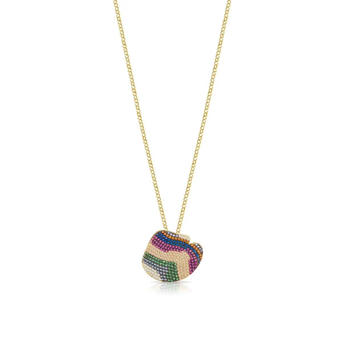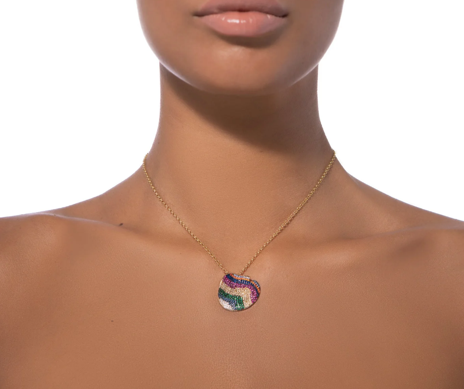 Collana da Donna della marca Sogni, il gioiello è realizzato in Argento Dorato lucido, raffigura una catena girocollo a maglia rolò con ciondolo a forma di Ventaglio, un simbolo particolare per la sua realizzazione fatta con zirconi incastonati di colori che vanno dal rosso, al verde, al blu in varie tonalità. Il diametro della catena è di 1 cm. La grandezza del ciondolo è di 3 cm. La lunghezza totale è di 42 cm. La chiusura è con maglia a moschettone.
