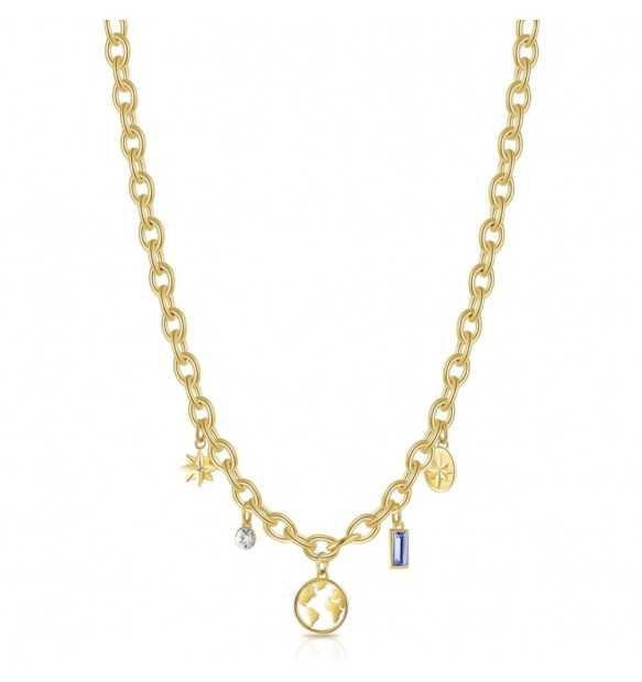 ollana da donna realizzata in acciaio anallergico dorato. Elementi pendenti impreziositi da cristalli colorati.