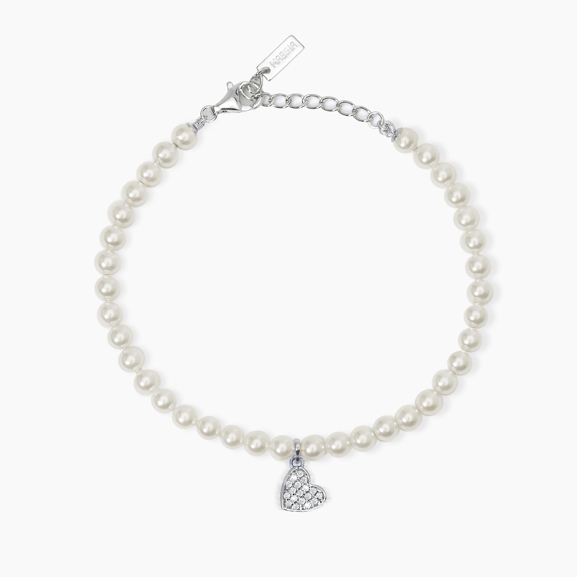Bracciale con perle conchiglia con ciondolo in argento a forma di cuore in pavé di zirconi.