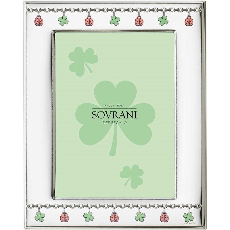 Cornice da bimbo e da bima Sovrani Argenti. Portafoto dimensione 13x18cm, in argento laminato con raffigurati dei quadrifogli di colore verde e delle coccinelle di colore rosso. La parte posteriore della cornice è in legno di colore bianco. Una cornice portafortuna e, per conservare nel modo più dolce, i momenti speciali del tuo bambino. I complementi d’arredo Sovrani Argenti sono dotati di astuccio originale e garanzia di qualità.