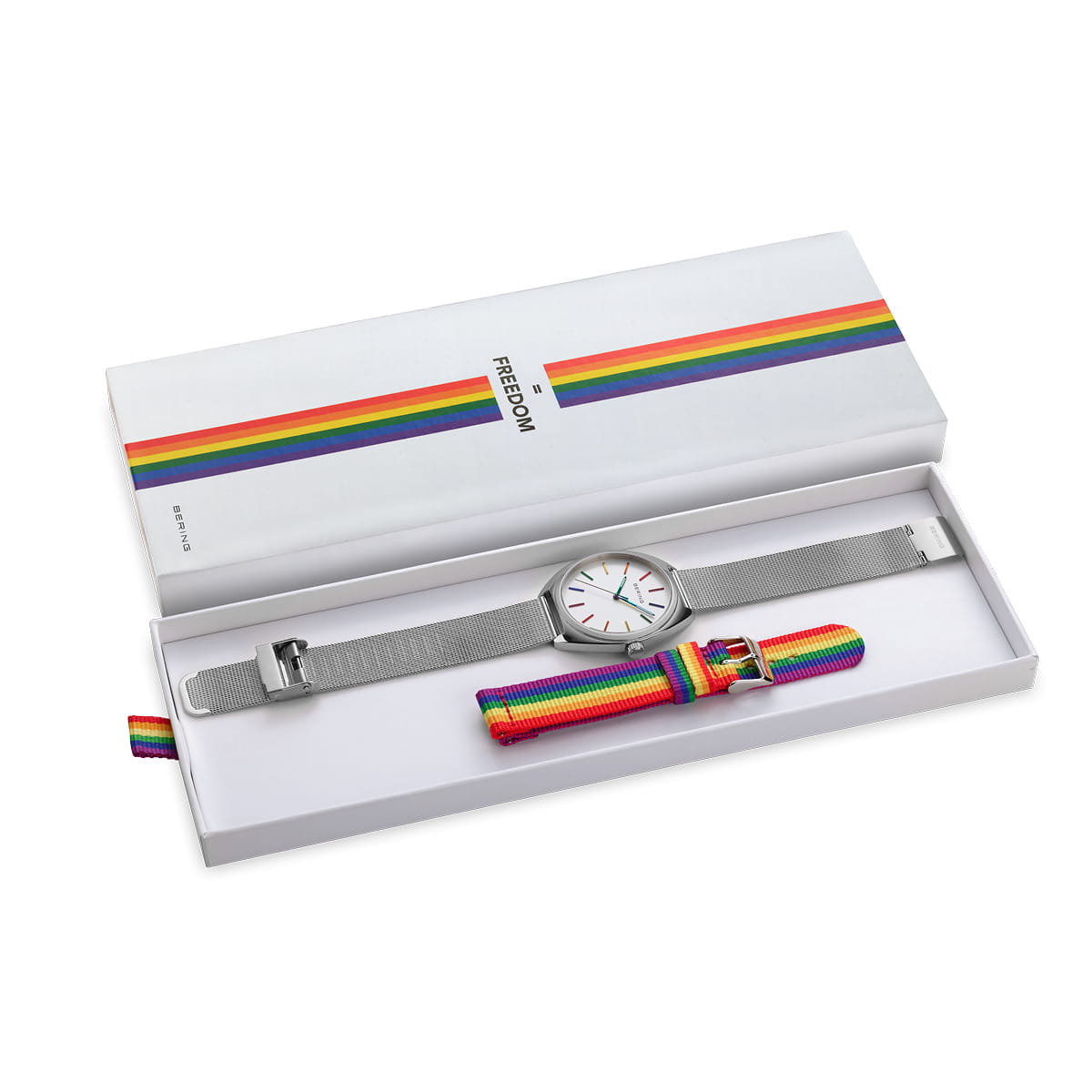 La collezione BERING FREEDOM combina l'eleganza senza tempo del design danese con un potente messaggio di solidarietÓ. La robusta cassa in acciaio inossidabile, ispirata alla chiara bellezza dell'Artico, Þ resistente all'acqua fino a 5 ATM e offre una protezione affidabile nella vita quotidiana. Il raffinato cinturino Milanese si armonizza perfettamente con il cinturino NATO intercambiabile dai vibranti colori dell'arcobaleno, simbolo di diversitÓ e inclusione.