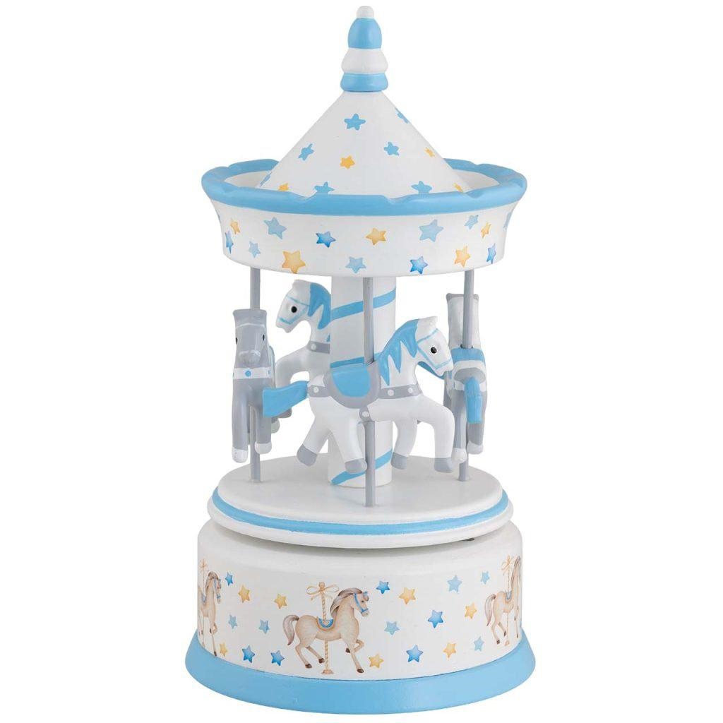 GIOSTRA CARILLON IN LEGNO DECORO CAVALLINI TETTO STELLINE AZZURRO 11X23CM