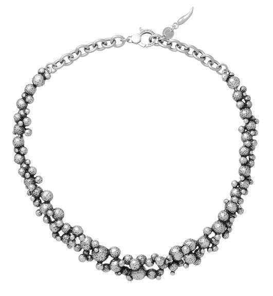 La collana Bubbles Þ un gioiello iconico che racconta tutto il fascino della fusione a cera persa. Una creazione in argento brunito caratterizzata da sferette con effetto martellato che si rincorrono, riflettendo la luce in modo particolarissimo. Un gioiello realizzato completamente a mano in azienda.
