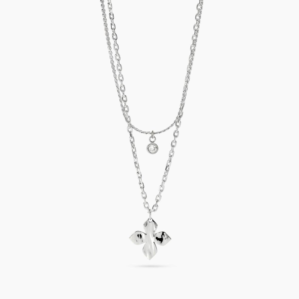 Girocollo in acciaio con catena forzatina diamantata con cristallo e catena serpentina con ciondolo fiore martellato.