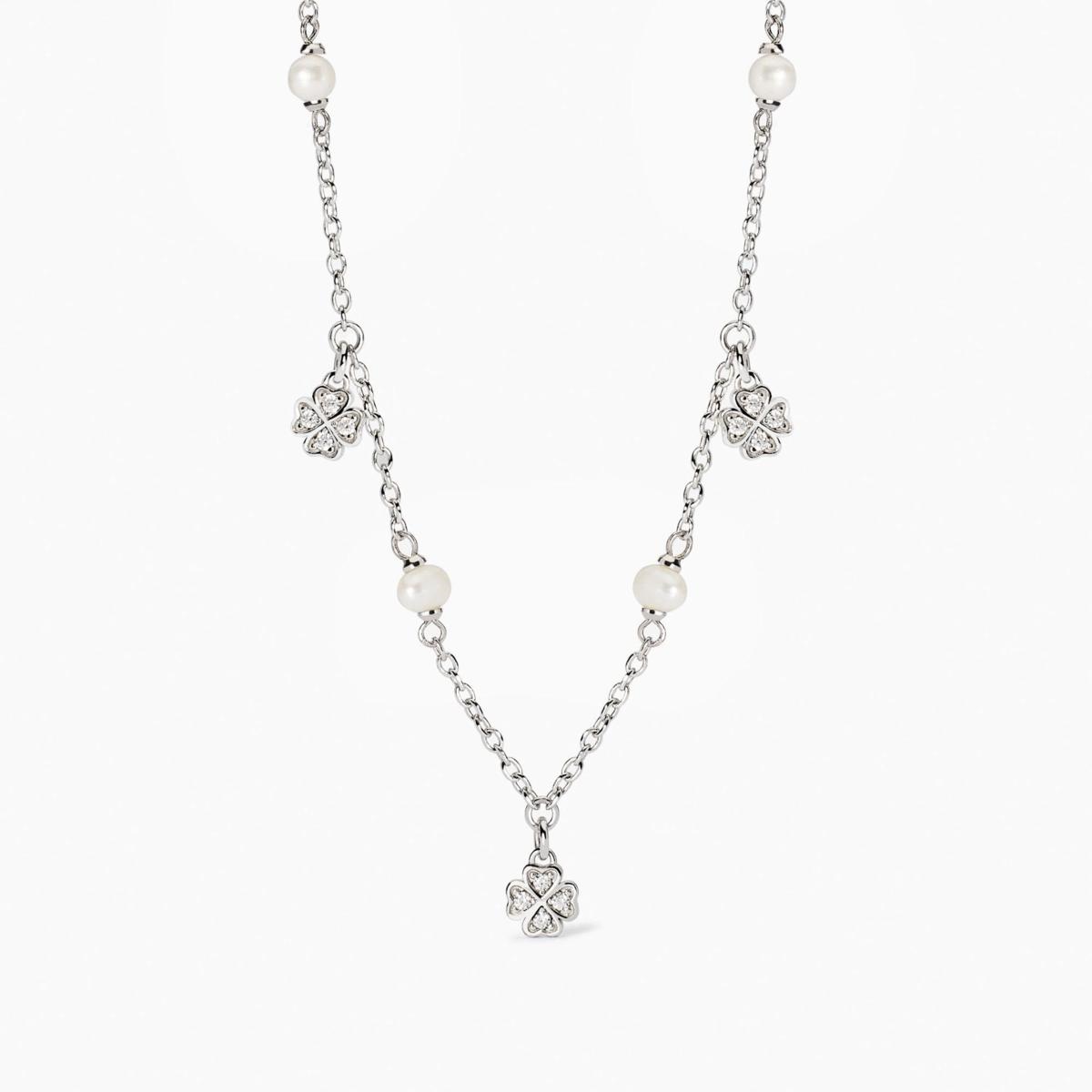 Girocollo regolabile da donna in argento rodiato con catena rolò, perle coltivate e ciondoli quadrifoglio con zirconi.