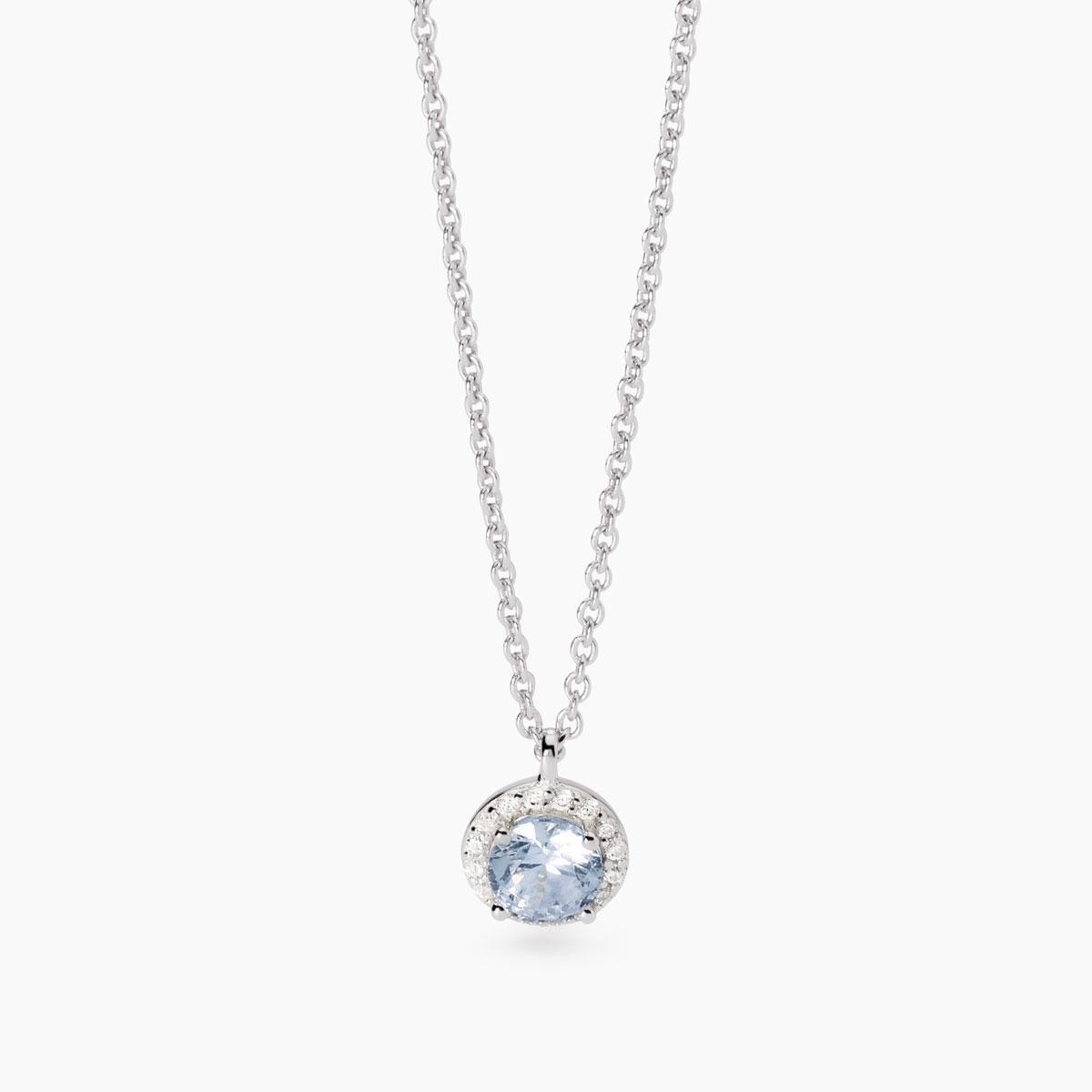 Girocollo regolabile da donna in argento rodiato con catena forzatina e pendente con acquamarina sintetica e zirconi.