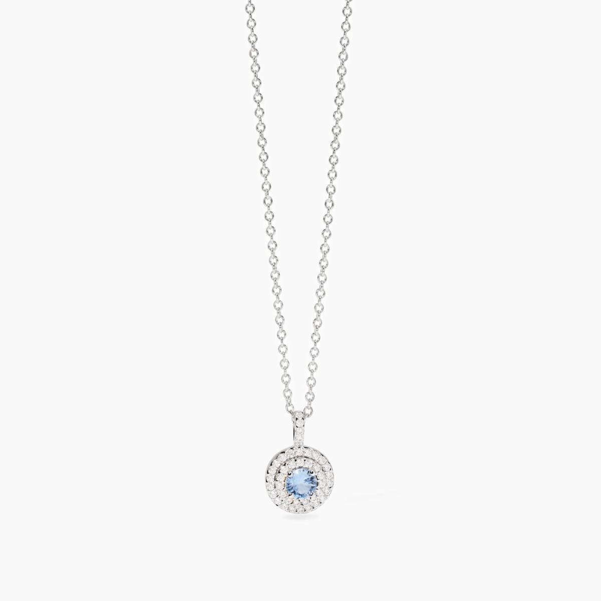 Girocollo in argento rodiato con catena rolò e ciondolo in acqumarina sintetica e zirconi bianchi.