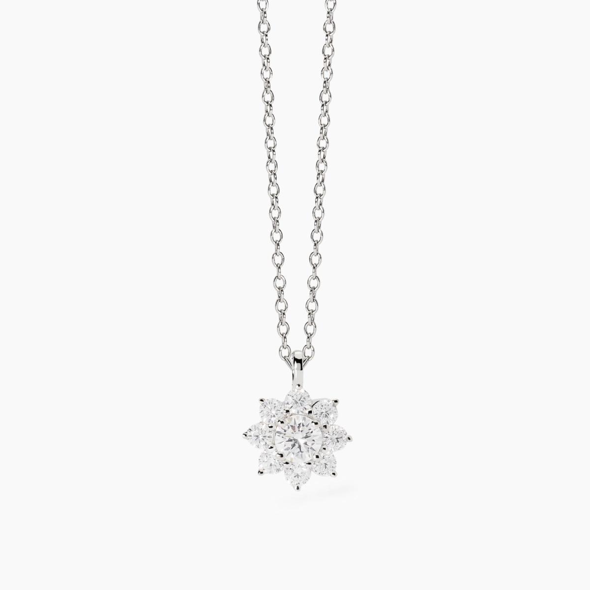 Girocollo in argento rodiato con catena rolò e ciondolo girasole in zirconi bianchi.