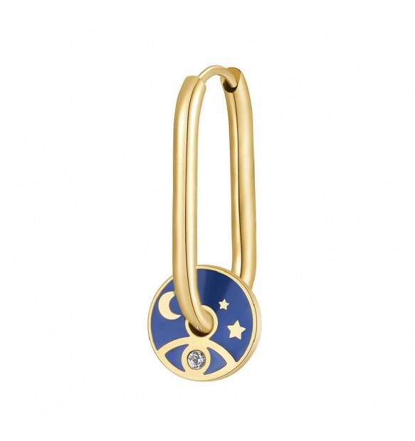 Mono orecchino ovale realizzato in acciaio anallergico dorato. Pendente tondo con smalto blu sul fronte e "Per Aspera Ad Astra" sul retro.