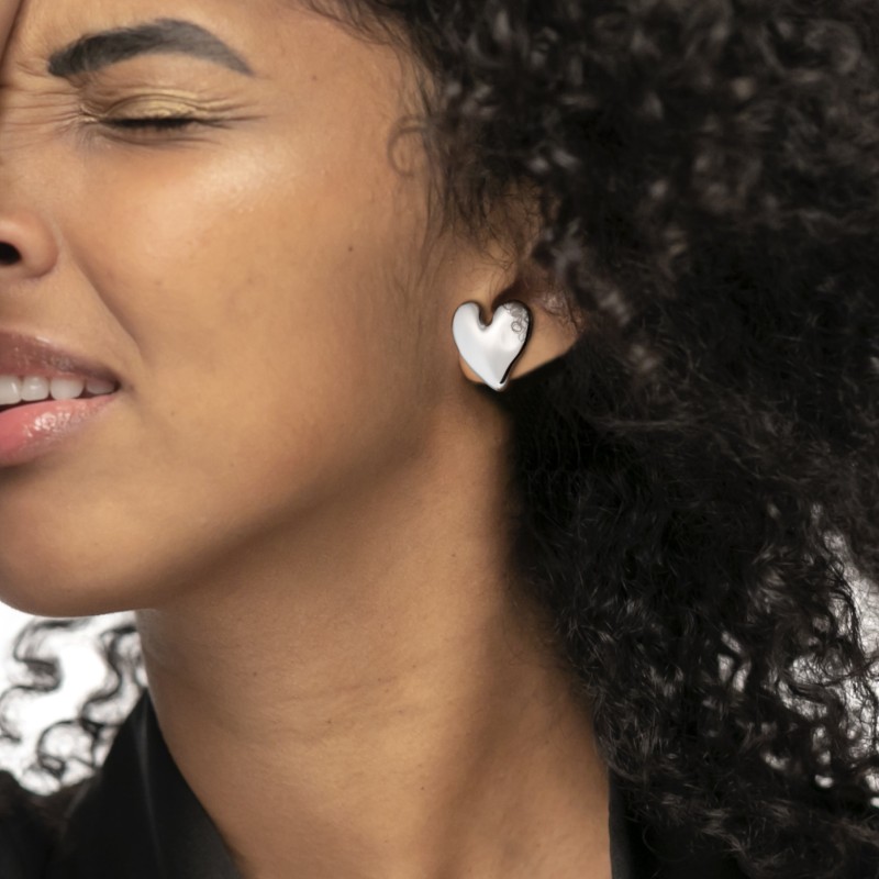 Mono orecchino a lobo in acciaio a forma di cuore irregolare martellato con misura 2,1*2,2 cm. Marlù logo laserato sul retro e sulla chiusura. Disponibile in acciaio e acciaio con pvd oro.