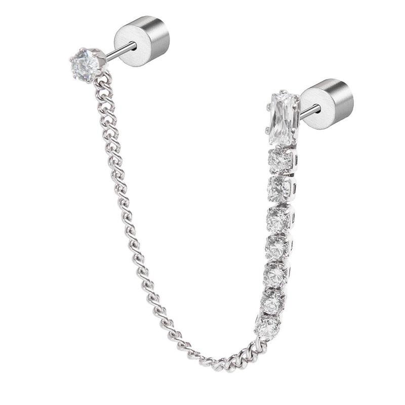 Mono orecchino con doppio orecchino. Formato da una catena a tennis con cubic zirconia, al cui vertice si trova un cubic zirconia a baguette, e da una catena a grumetta nella cui parte finale si trova il secondo orecchino, removibile, con cubic zirconia con diametro 3 mm. Lunghezza totale 6,7 cm.