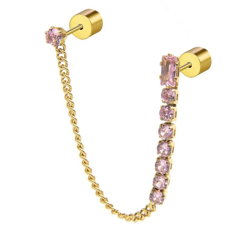 Mono orecchino con doppio orecchino. Formato da una catena a tennis con cubic zirconia, al cui vertice si trova un cubic zirconia a baguette, e da una catena a grumetta nella cui parte finale si trova il secondo orecchino, removibile, con cubic zirconia con diametro 3 mm. Lunghezza totale 6,7 cm.