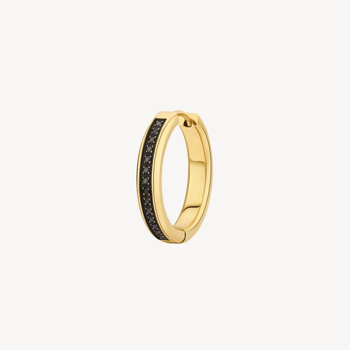 Orecchino singolo a cerchio in acciaio 316L e finitura pvd oro 14K con zirconi neri.