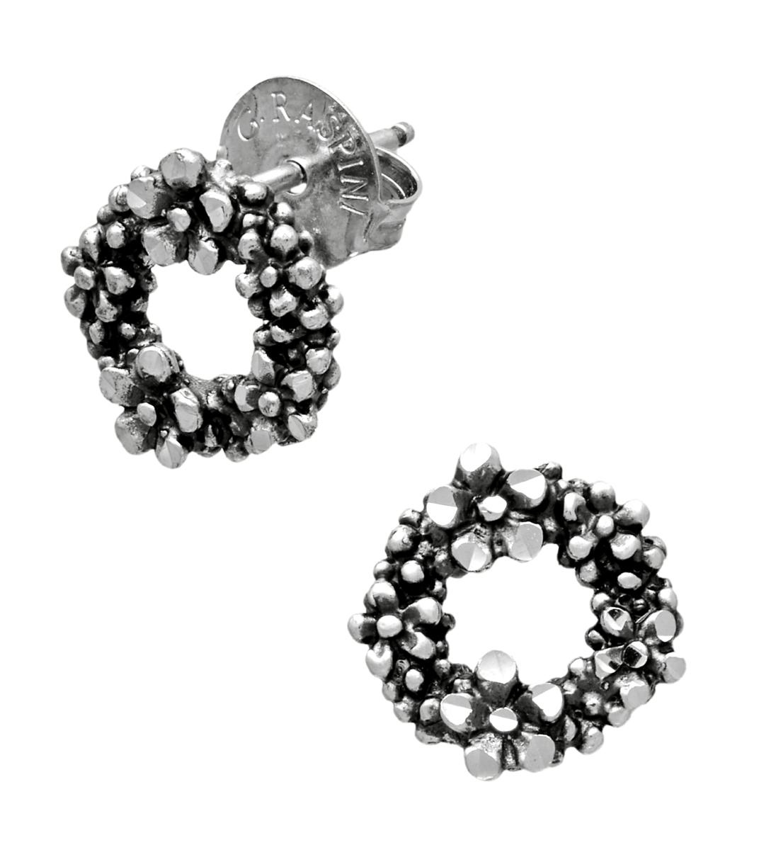 Piccoli fiori luminosi come cristalli. Gli orecchini bottone Millefiori sono realizzati a mano tramite fusione a cera persa. Particolare luminositÓ Þ sprigionata dai minuscoli e graziosi petali in argento diamantati.