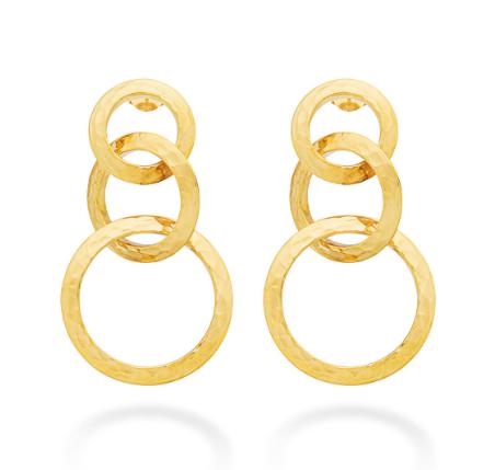 Questi meravigliosi orecchini a cascata in argento dorato, con anelli in tre dimensioni, mostrano una texture materica che regala una straordinaria lucentezza. Realizzati con lastra d'argento martellata a mano, raccontano la passione di Giovanni Raspini per il design contemporaneo e per la ricerca di nuove forme.