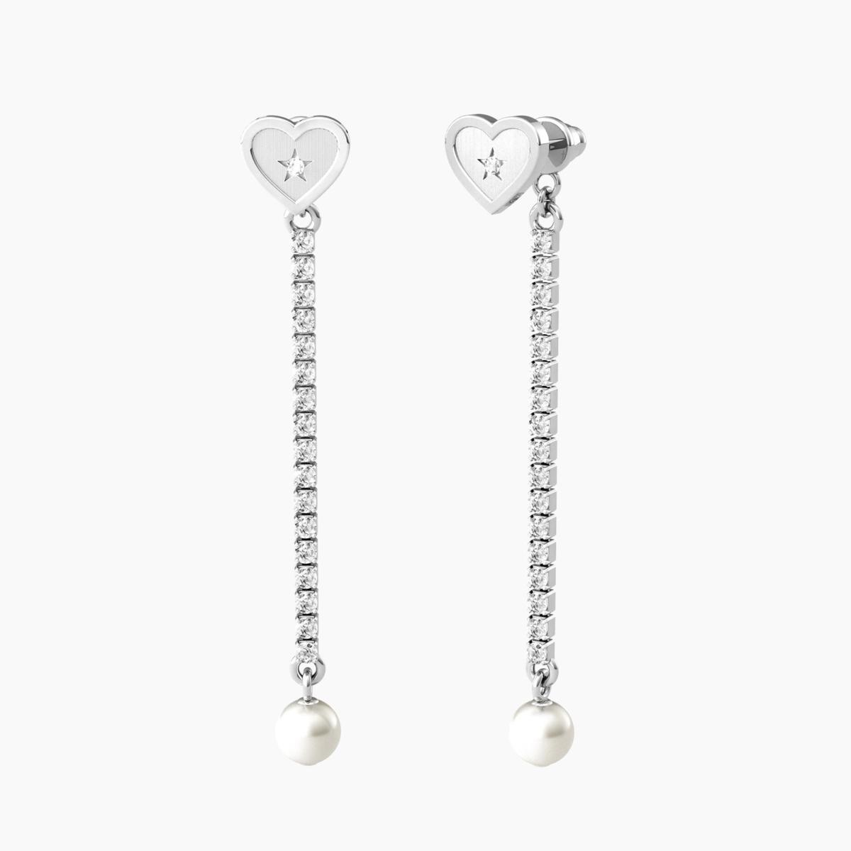 Orecchini in acciaio a forma di cuore con cristallo centrale e tennis pendente di cristalli con perle coltivate.