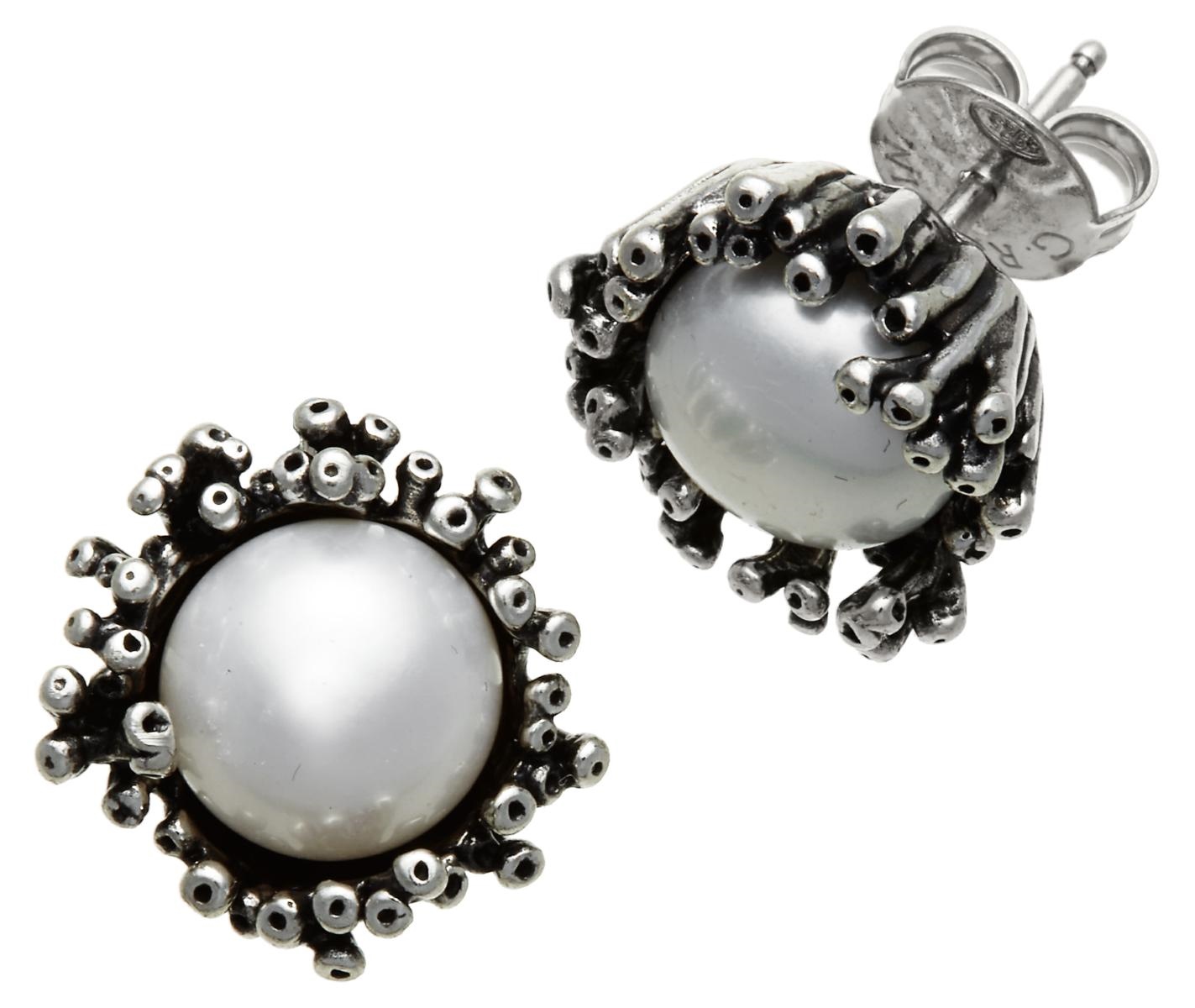 La forma elegante e sinuosa dell'anemone viene declinata in chiave minimal per questi orecchini bottone della Collezione Anemone. La forza plastica del disegno e i riflessi lunari dell'argento risplendono grazie all'effetto chiaroscurale della finitura brunita, impreziositi dalle perle naturali.