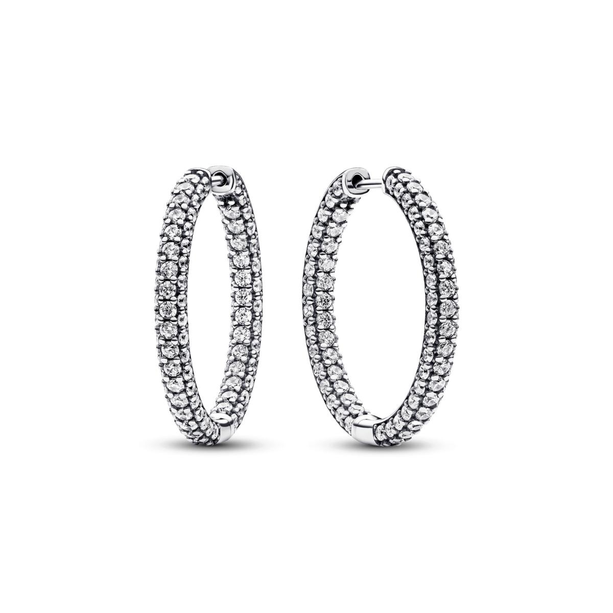 Aggiungi un tocco luminoso al tuo look di ogni giorno con questi Orecchini Cerchi PavÞ Fascia Singola Grandi rifiniti a mano. Realizzati in Argento Sterling 925, gli orecchini presentano una fila di pavÞ al centro del cerchio sia all'esterno che all'interno e una fila di pavÚ in pietre leggermente pi¨ piccole su ciascun lato, che catturano la luce da ogni angolo. Il retro degli orecchini a cerchio ha una superficie lucida. Indossali da soli o con altri gioielli decorati con pavÚ della collezione Timeless per illuminare il tuo look.