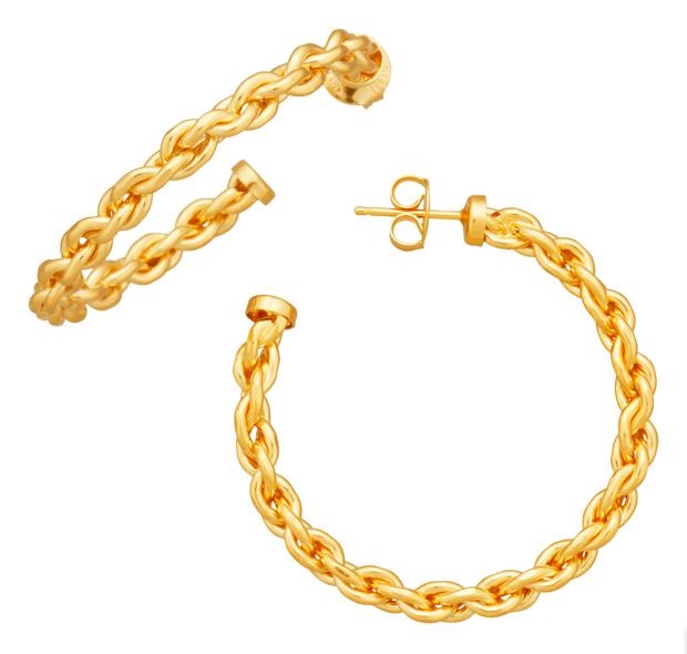 Giovanni Raspini propone questi grandi ed eleganti orecchini a cerchio in argento dorato fuso a cera persa. La forma di questi orecchini si ispira ad una catena classica, ma con effetto rigido. Fattia mano in azienda. Per una donna che ama la bellezza della semplicitÓ.