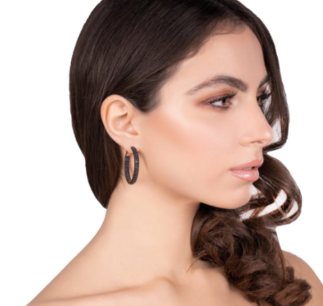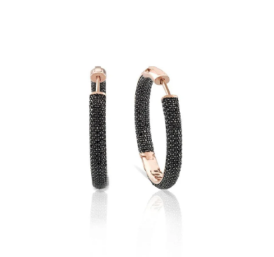 Sofisticati orecchini a cerchio grande in argento 925 con placcatura rosata. Impreziositi da intensi zirconi neri che creano un contrasto drammatico e affascinante. Il design audace e la combinazionecromatica unica li rendono perfetti per chi ama distinguersi con eleganza e personalità.