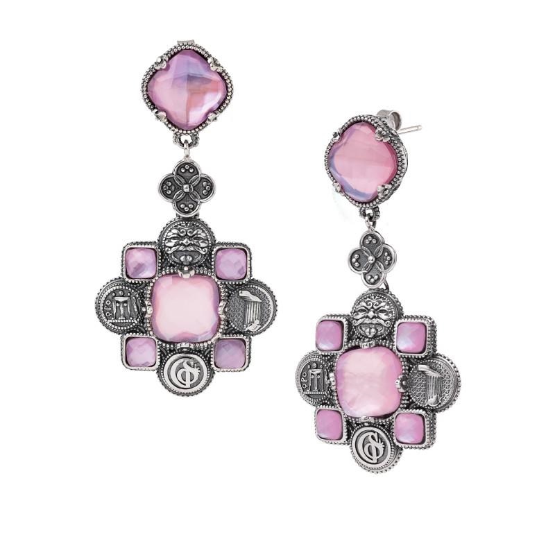 Originali orecchini pendenti, dallÆaccattivante linea geometrica. I colori sfaccettati delle pietre sapientemente alternati ai simboli della Magna Grecia.