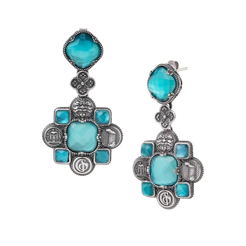 Originali orecchini pendenti, dallÆaccattivante linea geometrica. I colori sfaccettati delle pietre sapientemente alternati ai simboli della Magna Grecia.