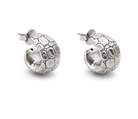 Orecchini a cerchio in argento impreziositi da una raffinata texture effetto coccodrillo. Questi gioielli racchiudono la forza dell’estetica animalier e una luminosa eleganza, risultando perfetti perogni occasione. La brunitura esalta la superficie dell’argento e mette in risalto ogni dettaglio del manto, valorizzando il carattere forte e identitario dell’animale da cui traggono ispirazione. Realizzati interamente a mano in azienda.