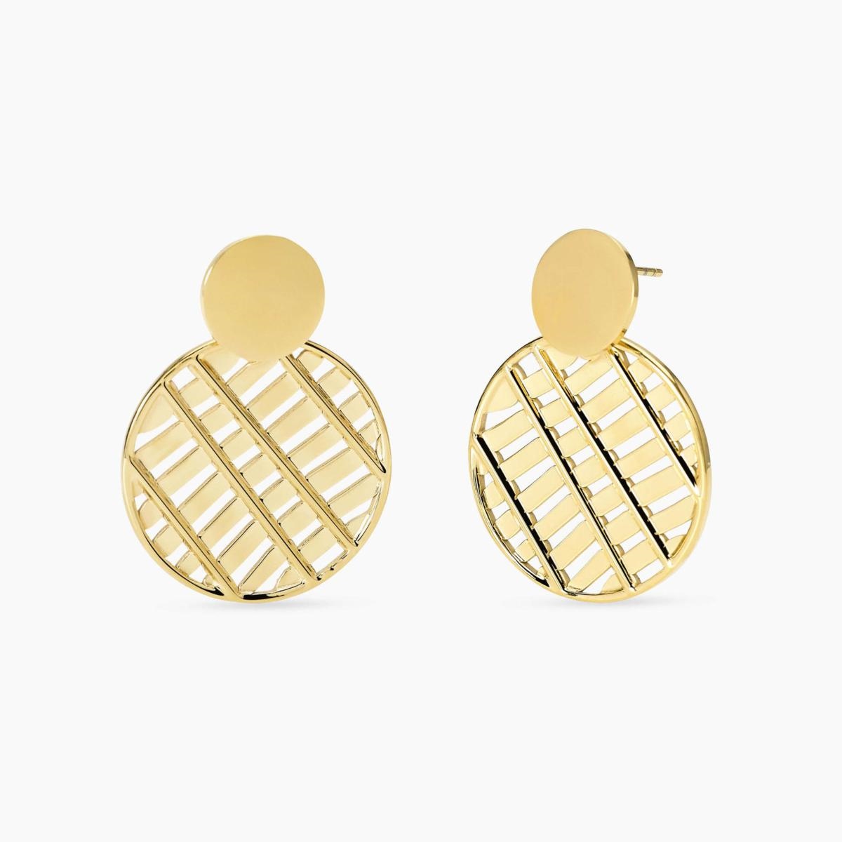 Orecchini tondi lucidi con pendente tondo in acciaio dorato.
