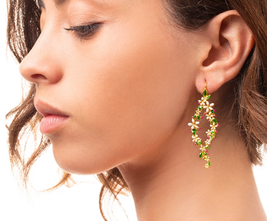 Il profumo delle notti dÆestate, di una pianta che cresce rigogliosa nellÆarea del Mediterraneo con i suoi fiori dai petali bianchi o gialli. Il gelsomino esprime lÆamore romantico e il candore dÆanimo e orna un paio di orecchini pendenti dipinti a mano dai nostri orafi, un omaggio alla bellezza del rifiorire.