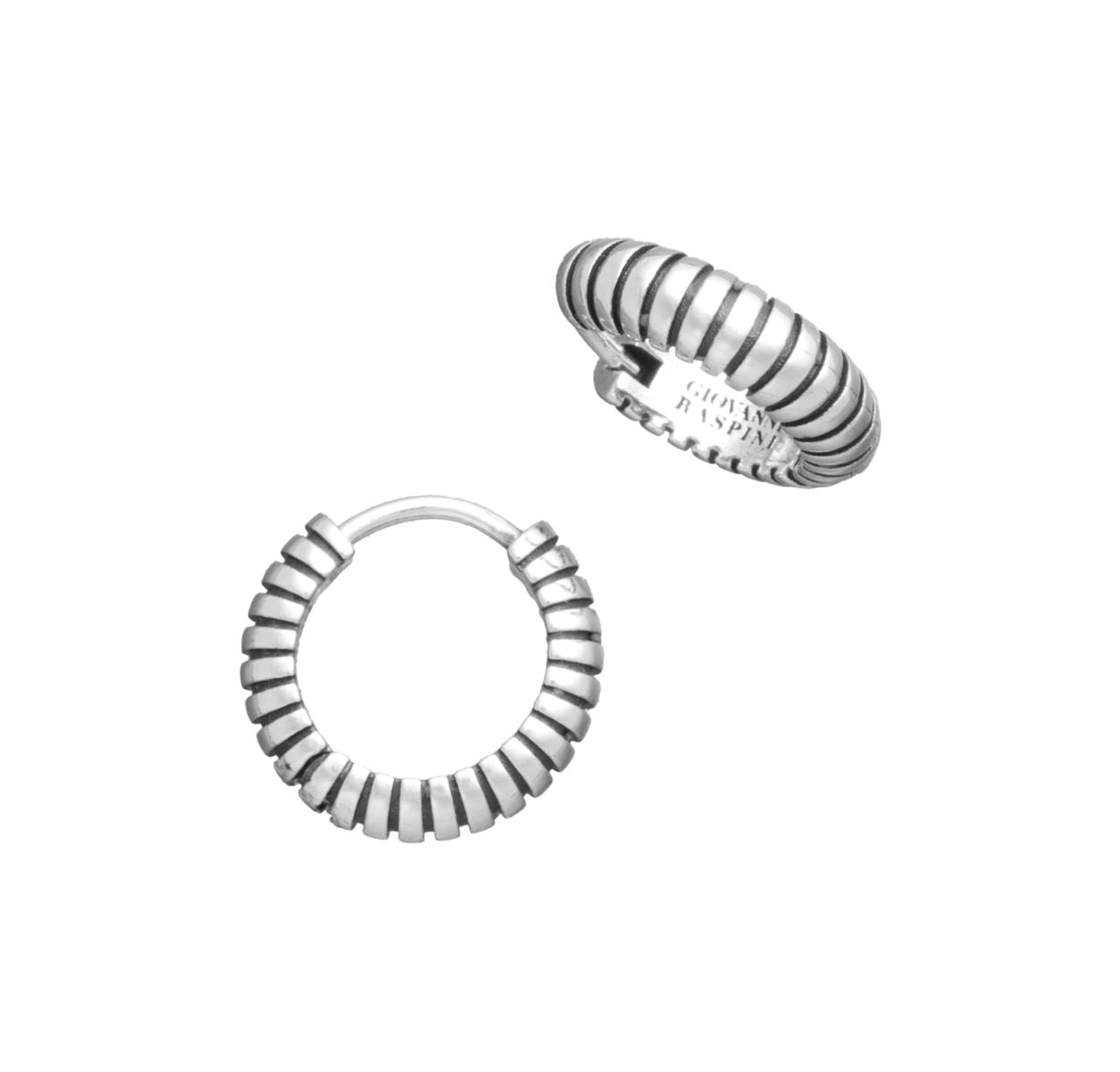 Decorati con un elegante ornamento rigato, questi deliziosi orecchini in argento brunito montano una nuova chiusura "a scatto", pratica ed elegante. Realizzati a mano in house.