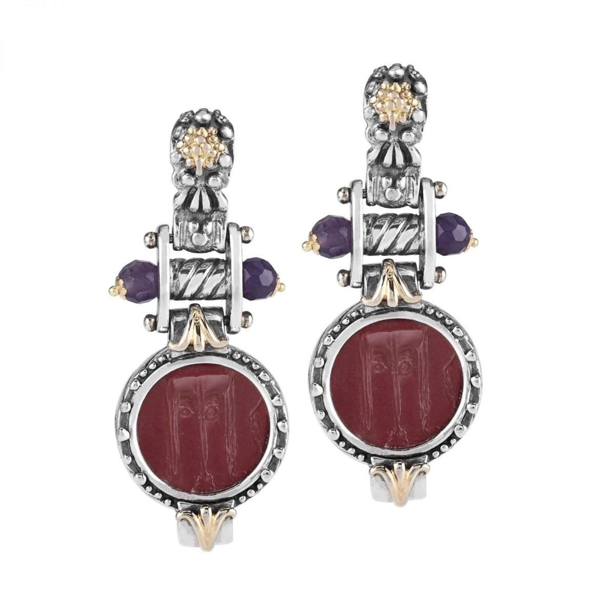 Orecchini in Oro 750/000, Argento 925/000 e Paste Vitree taglio rotondo. Sulla pasta vitrea Þ inciso il tripode delfico, che ricorda la fondazione dell'antica cittÓ magnogreca di Kroton.