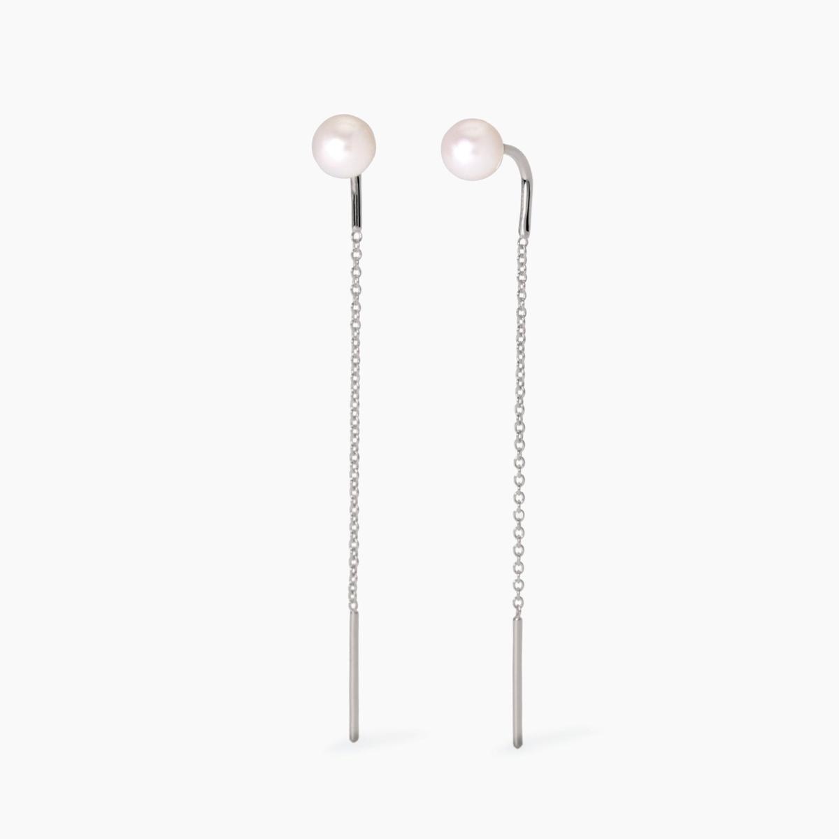 Orecchini pendenti da donna in argento rodiato con catena rolò e perle coltivate.