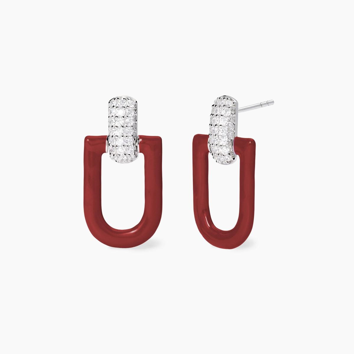 Orecchini in argento rodiato con zirconi bianchi e pendente in brass smaltato rosso scuro. • Dimensione orecchini: 13,9x26,85 mm