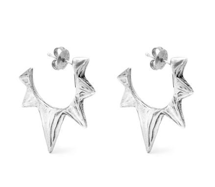 Divertenti e modernissimi, gli orecchini Rock Star in argento propongono una superficie spatolata a mano e bordi in forma di cuspidi. Sono realizzati interamente in home con l'antica tecnica della fusione a cera persa.