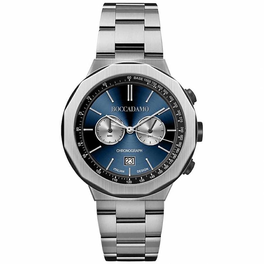 Orologio cronografo rodiato in acciaio maglia mesh placcata in Pvd quality con quadrante blu.