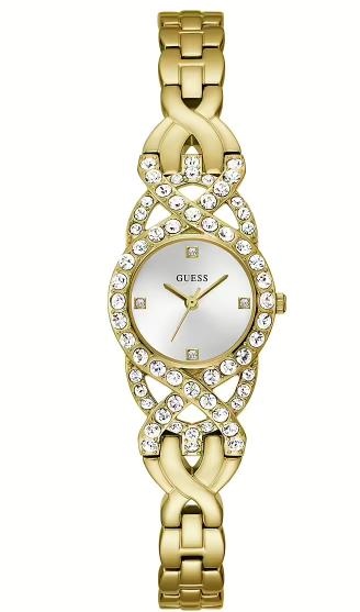 Orologio di Guess da donna della collezione Adorn. La cassa Þ in acciaio riciclato, di colore oro, a forma tonda, dimensione: 23 mm, con cristalli. Il quadrante Þ di colore argento, finitura quadrante: Sunray. Il cinturino Þ in acciaio riciclato, di colore oro, finitura: lucido. Chiusura cinturino: G-link. Movimento: quarzo. Display: analogico. ImpermeabilitÓ: 10. Caratteristiche: 3H. La referenza Þ: GW0682L2