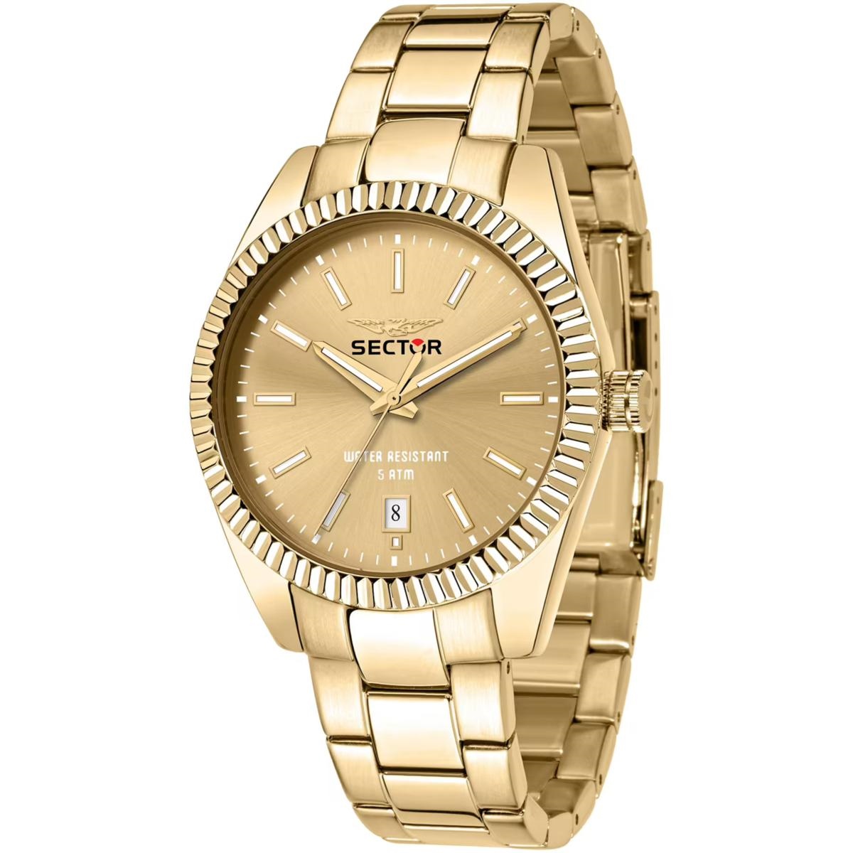 OROLOGIO SECTOR 240 - R3253240026 - Sector experience: No Limits, Genere : Uomo, Materiale e finitura cassa: Acciaio, Misura cassa: 41mm, Spessore cassa: 10,80, Finitura cassa: Lucido, Colore cassa: Gold, Vetro: Vetro minerale, Materiale cinturino: Bracciale in metallo, Colore cinturino: Oro, Chiusura: Fibbia diver con blocco sicurezza, Movimento: Quarzo, Water resistant: 5 atm, Garanzia: Ufficiale 3 anni, Ufficiale 3 anni, Ufficiale 3 anni Sector, Confezione: Originale Sector
