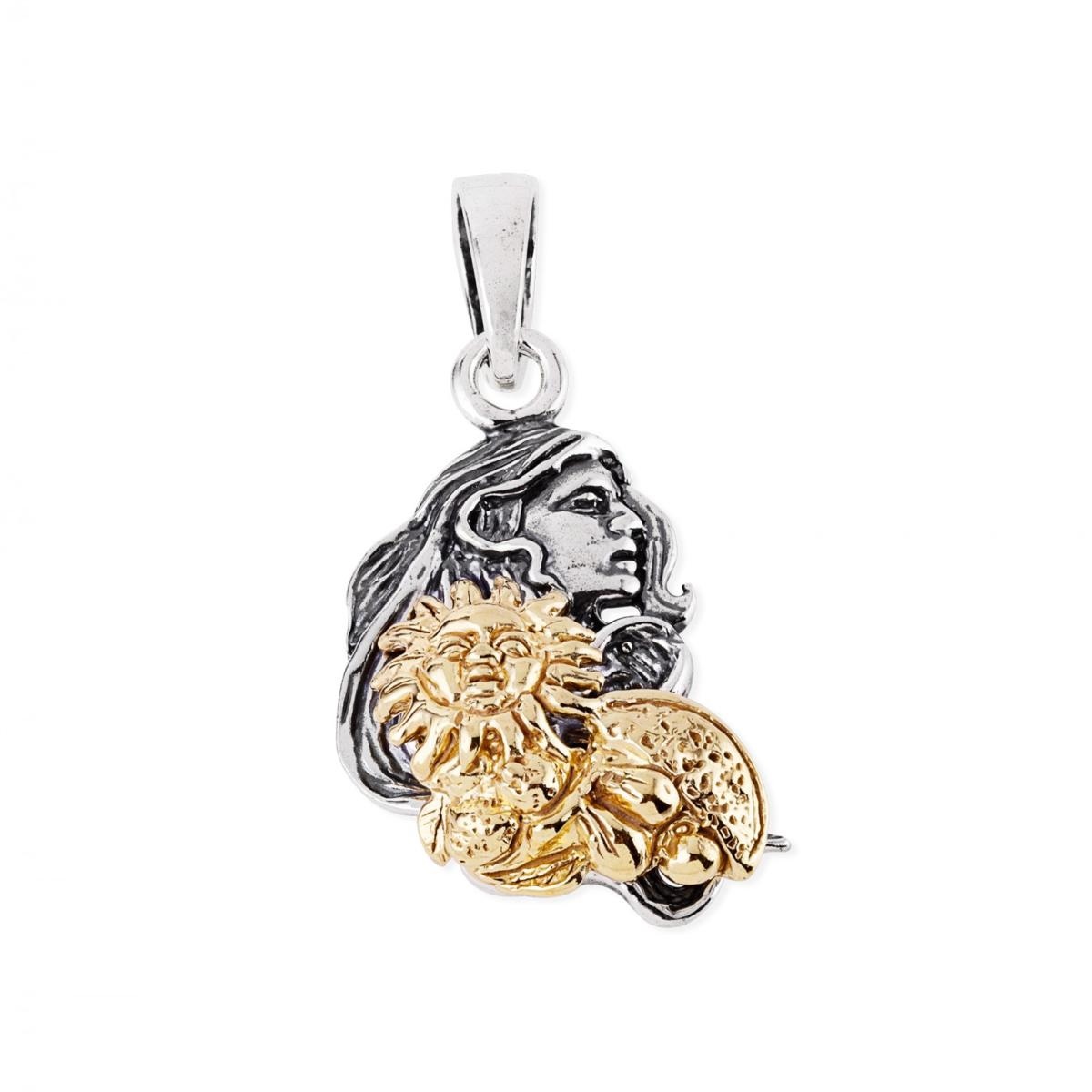 Pendente in argento che raffigura l'elegante volto di Venere con un'accurata e fine lavorazione a mano. La preziosa cromia dell'argento dorato riproduce un sole, simbolo del mese di Agosto. Un accessorio perfetto per ogni occasione, un gioiello che parla di te!