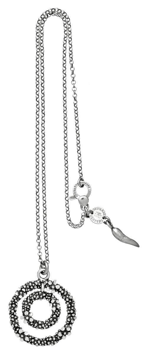 Questo pendente con iconico design floreale a doppio cerchio è abbinato ad una catena mini rolò da 45 centimetri. La luce si manifesta al suo massimo sui minuscoli e graziosi petali in argento, resi scintillanti dalla tecnica della diamantatura. Fatto a mano in azienda.