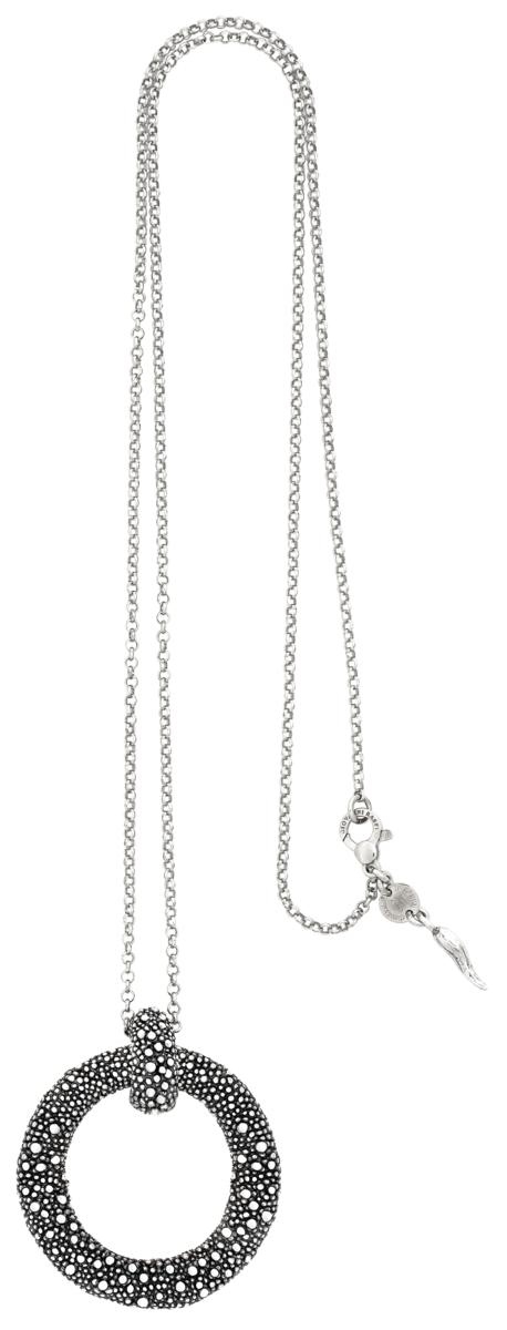 Il pendente Petit Perlage celebra il trionfo della fusione a cera persa. I sorprendenti effetti di chiaroscuro sono garantiti dalla diamantatura del pavÚ di sferette di argento brunito, caratterizzato da una elegante texture contemporanea. Il gioiello Þ munito di una catena rol? in argento di cm 80. Realizzato a mano in azienda.