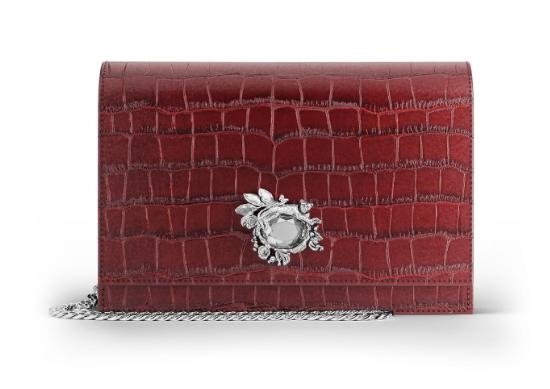 Raffinata ed esclusiva, la pochette Jungle rappresenta una delle novità più distintive della collezione. Realizzata in pregiata pelle croco borgogna, un vitello lucido di altissima qualità che riproduce con precisione la texture esotica del coccodrillo. La chiusura-gioiello è un vero capolavoro di artigianalità: un leopardo in bronzobianco è posato delicatamente su un cristallo ovale sfaccettato.La chiusura con bottone a pressione nascosto assicura praticità e discrezione, mentre l’interno, sorprendentemente capiente, è dotato di una comoda tasca per custodire gli essenziali. Completata da una catena in metallo di 120 cm, rimovibile tramite due eleganti moschettoni, può essere indossata a mano come clutch oppure a tracolla.