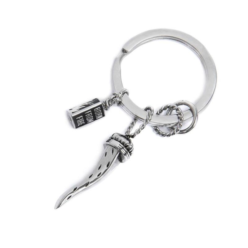 Portachiavi tondo in acciaio con diametro 30 mm con logo Marlù laserato sul fianco, contenente due anellini uno dei due con texture e due pendenti. Il primo pendente è a forma di corno in acciaio contrama con black oil opaco. Il secondo pendente con elemento triangolare in acciaio inciso con black oil: su un lato una fiamma, su un altro il logo Marlù, su un altro la frase "BORN FROM FIRE". Lunghezza totale 6,7 cm. Materiali: acciaio, black oil opaco