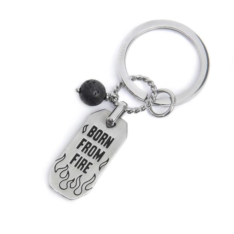 Portachiavi tondo in acciaio con diametro 30 mm, con anellino con texture con due pendenti: una sfera di pietra composita nera lavica e una targa in acciaio con con black oil con sul fronte fiamme inrilievo e sul retro incisa scritta con black oil opaco "BORN FROM FIRE" e fiamme. Lunghezza totale 7,3 cm.