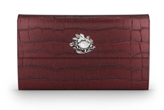 Un accessorio di classe intramontabile, questo portafoglio è realizzato artigianalmente in pregiata pelle croco borgogna: un vitello lucido di alta qualità, lavorato per riprodurre con raffinatezza la texture del coccodrillo. Elegante e funzionale, offre un’organizzazione impeccabile grazie ai sei scomparti portacarte, due ampie tasche a soffietto per le banconote e una spaziosa tasca portamonetecon chiusura a zip. La patta centrale, impreziosita dalla chiusura-gioiello in bronzobianco rappresentante un leopardo che si adagia su un grande cristallo incolore in taglio ovale sfaccettato, custodisce una tasca supplementare cui corrisponde un vano simmetrico sul lato opposto.