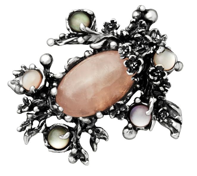 Tutto il fascino delle lavorazioni artigianali di Giovanni Raspini. La spilla in argento brunito monta un grande quarzo rosa ovale, due madreperle grigie e tre madreperle rosa sempre doppiate col quarzo. E' realizzata completamente a mano.